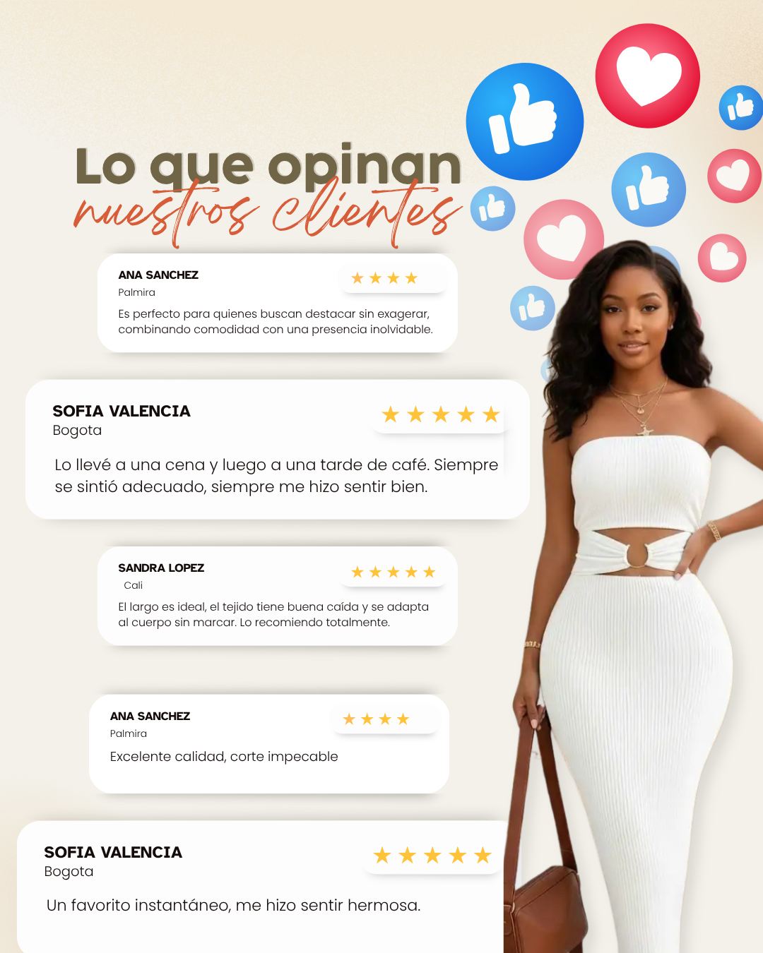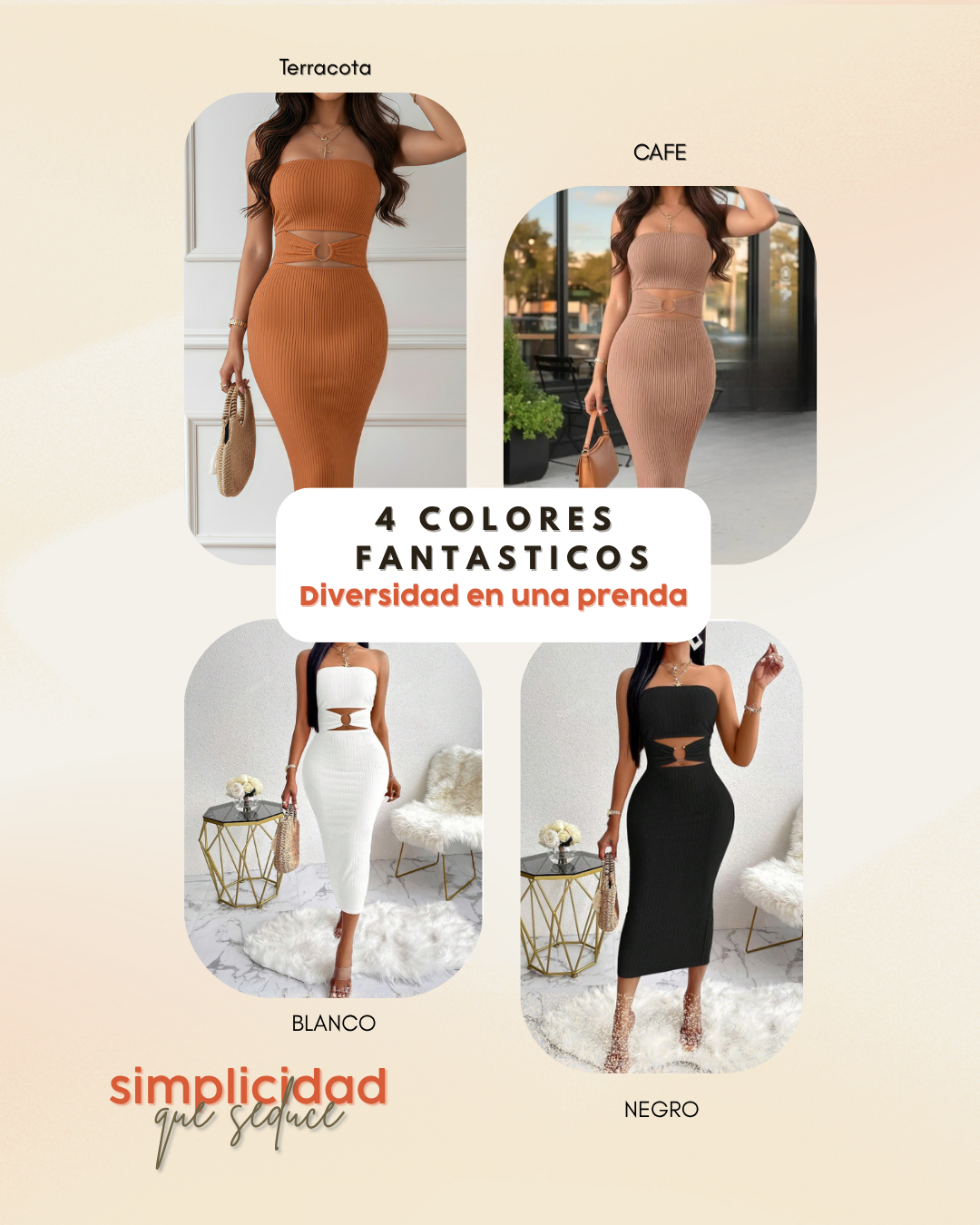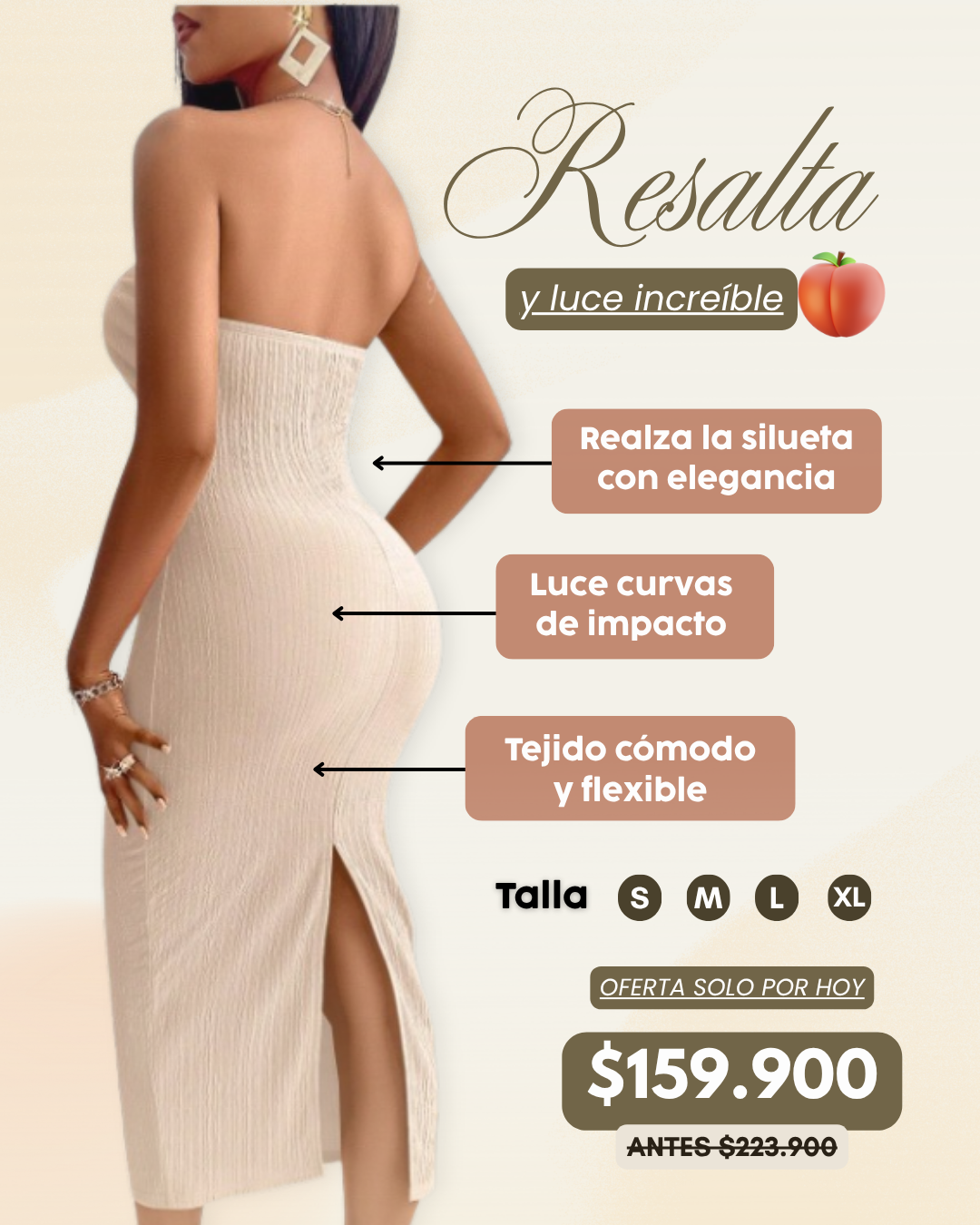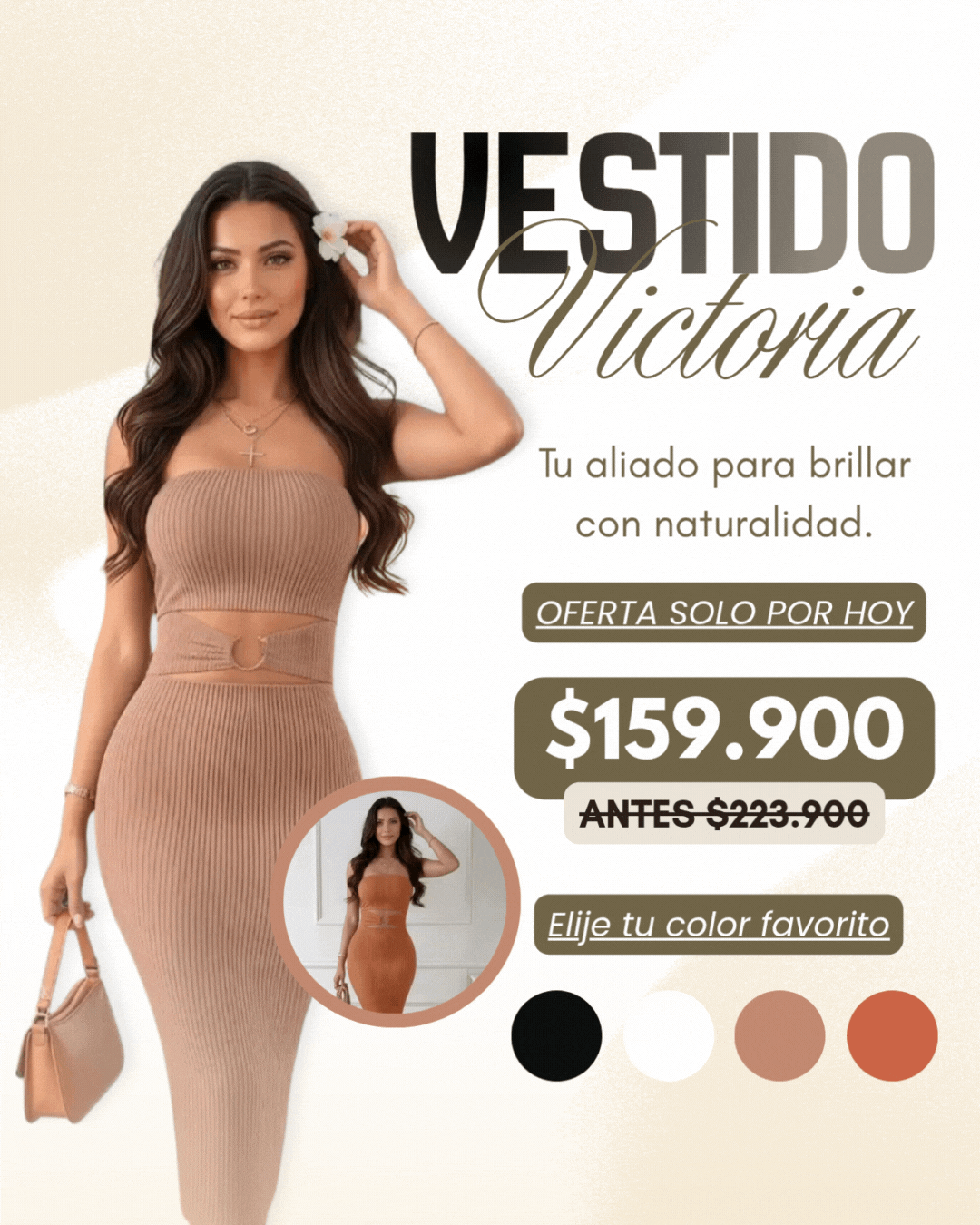Nuestro Vestido Victoria está confeccionado con una mezcla de poliéster y spandex, lo que garantiza una textura suave, elástica y cómoda. Este material se ajusta al cuerpo resaltando la figura sin perder comodidad.